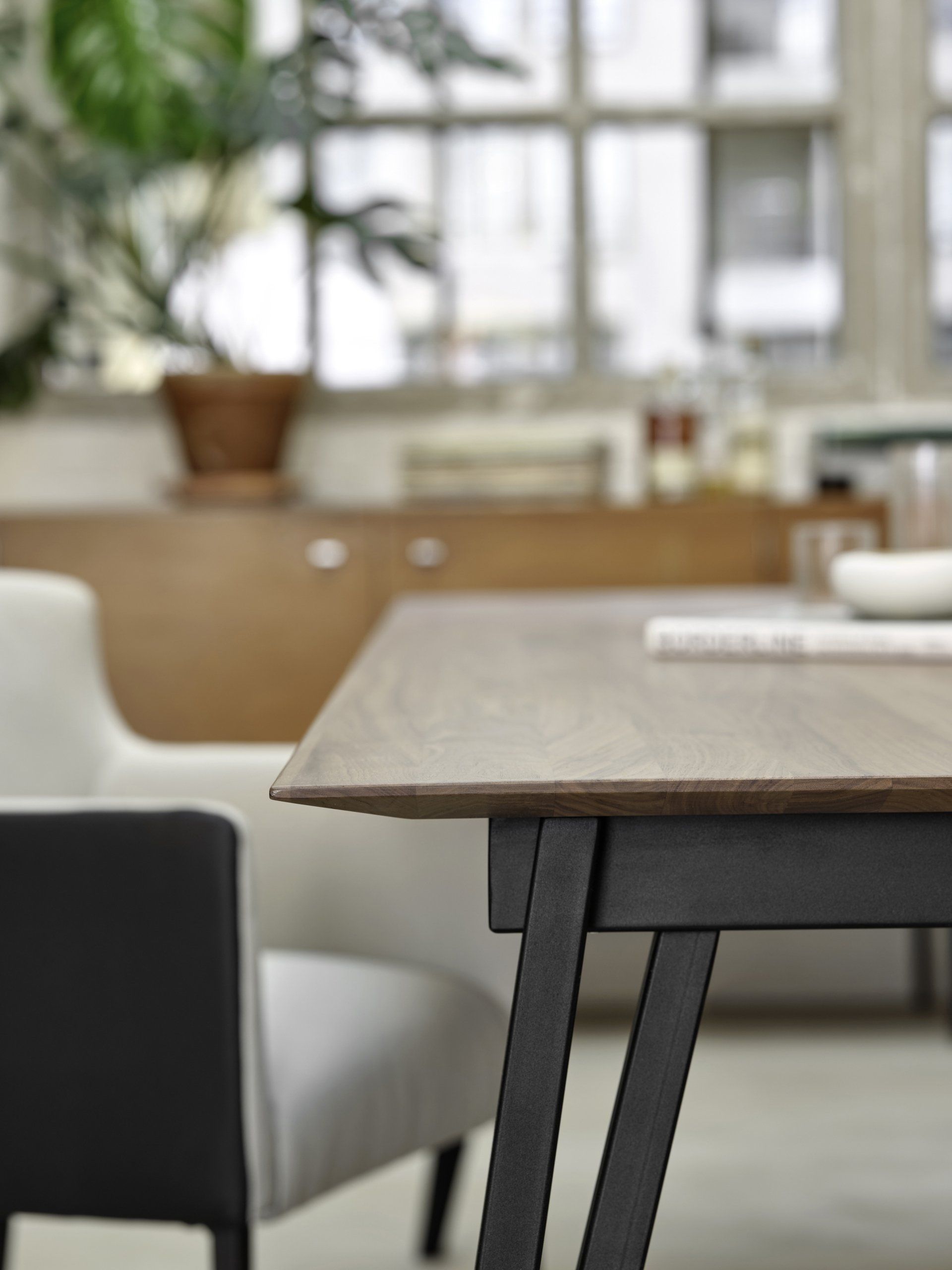 Die Tischplatte mit abgeschrägten Kanten ist in Buche, Eiche, wilder Eiche oder Nussbaum erhältlich. Alle unsere Hölzer stammen aus nachhaltig bewirtschafteten europäischen Wäldern.